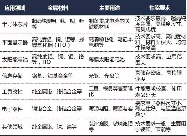 按應(yīng)用領(lǐng)域分類: 半導(dǎo)體芯片靶材、平面顯示器靶材、太陽能電池靶材、信息存儲靶材、工具改性靶材、電子器件靶材、其他靶材