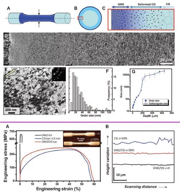 圖3 硬化速率上升以及額外的應變硬化. A 工程應力應變曲線,應變速率為5*10-4s-1.CG代表均勻的粗晶樣品;GS:代表梯度層,厚度約為120 μm:GS–CG:厚度為1mm的梯度-粗晶樣品。NS:納米金屬樣品. GS–CG+:在應變分別為0.05, 0.1, 0.15, 和 0.2的加載-卸載樣品. B 應變硬化速率-真應變曲線;C維氏顯微硬度(H) vs深度曲線;(D)不同拉伸應變后δ H (H增量)vs深度的曲線。