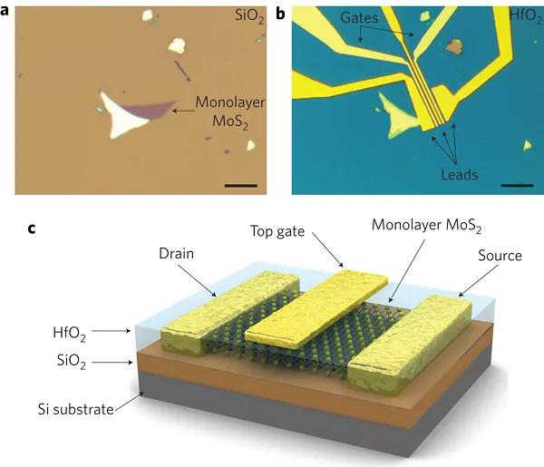 二維材料在下一代納米電子器件中的應用很有吸引力,因為與一維材料相比,用它來制造復雜的結構相對容易。研究最廣泛的二維材料是石墨烯,這是由于其具有豐富的物理性質和高電子遷移率。但是,原始石墨烯不具有帶隙,而帶隙這一性質對于包括晶體管在內的許多應用都是必不可少的。設計石墨烯帶隙會增加制造復雜性,或者將遷移率降低到應變硅膜的水平,或者需要高電壓。盡管單層MoS2具有1.8 eV的大固有帶隙,但先前報道的在0.5-3 cm2·V-1·s-1范圍內的遷移率對于實際設備而言仍然太低。此文中,作者使用氧化鉿柵極電介質獲得了超過200 cm2·V-1·s-1的室溫單層MoS2遷移率,接近石墨烯納米帶,并展示了電流開/關比為1×108,待機功耗極低的室溫晶體管。由于單層MoS2具有直接的帶隙,因此可用于構造帶間隧場效應晶體管,與傳統晶體管相比,其功耗更低。單層MoS2還可以在需要薄透明半導體的應用中補充石墨烯,例如光電子學和能量收集領域。