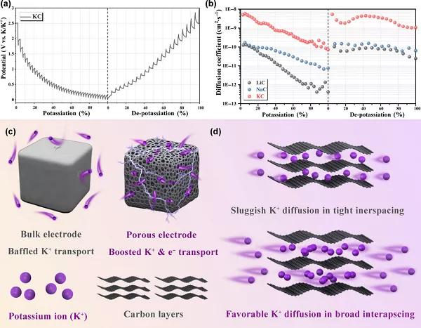 (c) 孔結(jié)構(gòu)工程和 (d) 層間工程協(xié)同作用快速儲鉀機制;