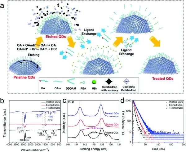 d)原始、蝕刻和處理的量子點的時間分辨PL衰減譜。