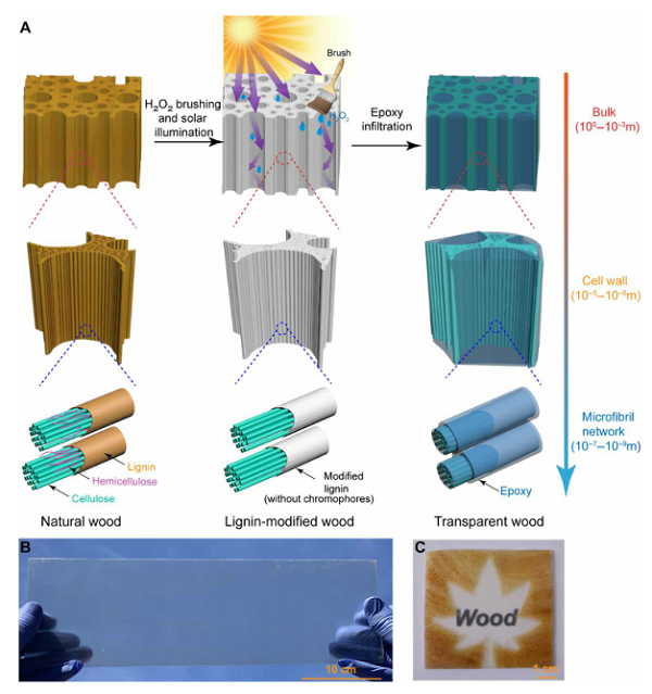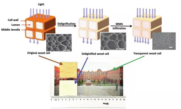 透明木材是一種多功能木質復合材料,關于透明木材的第一份報道來源于Fink公司于1992年編寫的木材形態學研究。后來,通過將機械性能與光學透射率研究相結合,提出了透明木材在工程相關領域的應用。由于在基本木材特性基礎上增加了光學透射率,透明木材有助于木材解剖學研究,還可用于透光智能建筑、電子設備,以及光伏電池和光源等光子設備。