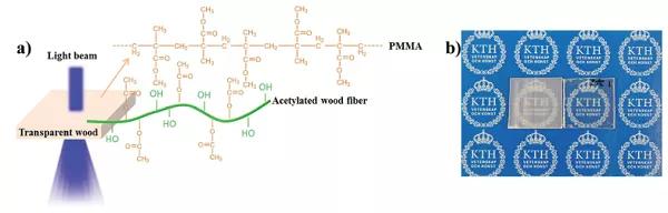 圖2 (a)改性高透明木材結構的示意圖;(b)非乙酰化透明木材(左)和乙酰化透明木材(右)。