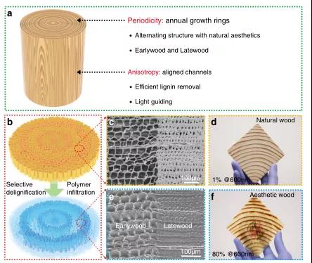 https://pubs.rsc.org/en/content/articlelanding/2018/TA/C7TA09973H#!divAbstract1. Nat. Commun.: 適用于節能建筑的可擴展、美觀透明木材如今,節能建筑材料對于降低室內能耗非常重要,因為它們能夠更好地隔熱、促進有效的陽光收集并提供舒適的室內照明。在此,美國馬里蘭大學胡良兵團隊基于空間選擇性脫木素和環氧樹脂滲透工藝,展示了一種新穎的可伸縮的美觀透明木材,具有美學特征(例如完整的木材圖案)、優異的光學性能(平均透光率約為80%,霧度約為93%)、良好的紫外線阻擋能力和低熱導率(0.24 W m-1K-1)。此外,美觀木材的快速制造工藝和機械強度(91.95 MPa的高縱向抗拉強度和2.73 MJ m-3的韌性)有利于放大生產規模(320mm×170mm×0.6mm),同時節省大量時間和精力。這種美觀的木材在節能建筑應用中有很大的潛力,如玻璃天花板、屋頂、透明裝飾和室內面板。