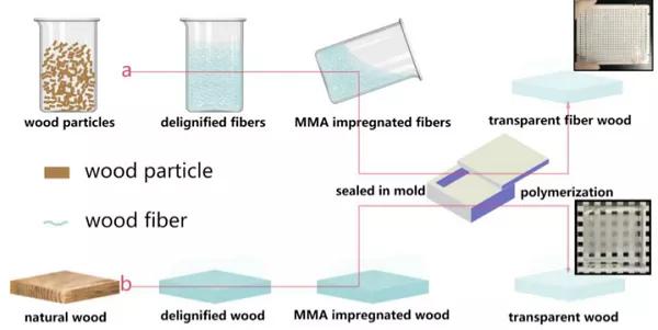 圖4 透明纖維木材(a)和傳統透明木材(b)的合成方法和照片。