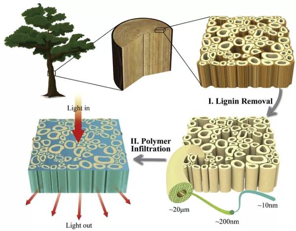 圖7 通過去除木質素和隨后的聚合物滲透制造具有高光學霧度的透明木材的示意圖。