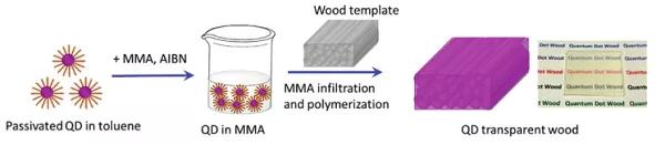 https://www.sciencedirect.com/science/article/pii/S2211285516301410包含活性熒光材料的功能光轉換層是許多器件中的必要組件。瑞典皇家理工學院Ilya Sychugov團隊通過用富含量子點的甲基丙烯酸甲酯滲透木材模板,成功制造了結合光學和承載功能的發光透明木材。在這一轉變過程中,沒有檢測到光學退化的跡象,表明量子點與封裝用透明木材基質間良好的相容性。木質結構引入了強散射,導致嵌入量子點的漫射發光,這對于平面光源和發光建筑構件或家具是有利的。木材細胞壁的表面改性將有助于調節這種新材料的光散射特性,使其具有更廣泛的應用前景。