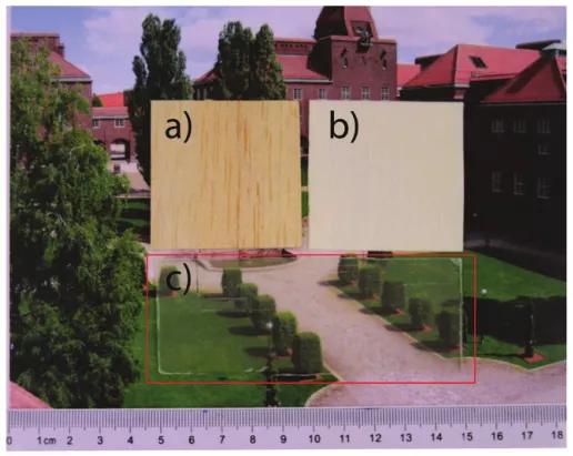圖10 (a)化學處理前的輕木照片;(b)脫木質素的木材;(c)透明木材(沒有染料分子嵌入)。