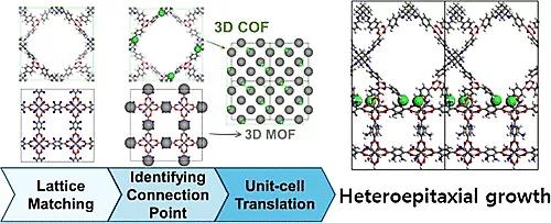 共價-有機框架(COFs)是多種能源/環境應用中具有前途的候選材料,但與金屬-有機框架(MOFs)等其他多孔材料相比,這些材料更難合成。這項研究開發了一種使用MOFs作為襯底的計算篩選算法,以便在理論上實現三維COFs(3D COFs)的異質外延生長。該算法在原子/分子水平上詳細描述了MOF@COF的界面,以便使用自下而上的方法構筑3D COFs。最終,該算法產生了19對適合在MOF表面異質外延生長3D COFs的MOF@COF候選材料。
