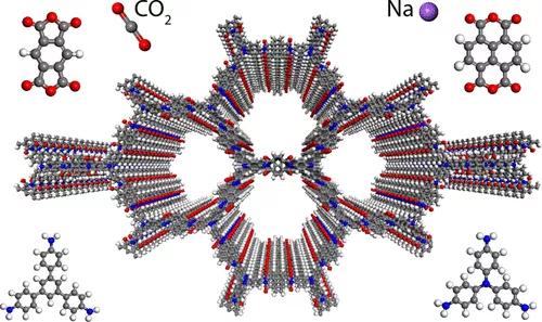共價有機框架是一類新興的材料家族,具有多種潛在的應用價值。它們的多孔框架和氧化還原特性的活性中心具有氣體/離子吸附特性,使其成為下一代電池中安全、廉價和可控的電極材料,以及碳捕獲中的CO2吸附材料。通過將芳香族三胺與芳香族二酐結合,發展了四種聚酰亞胺COFs,并進行了細致的結構和電化學表征。通過DFT計算和粉末XRD的結構表征,顯示酰亞胺鍵傾向于以一定角度形成,從而破壞了二維對稱性,縮小了孔徑并拉長了孔壁。兩種性能最佳的COFs源自相同的三胺結構單元,結合力場計算,揭示了意想不到的結構-性質關系。特定的幾何形狀為鈉離子嵌入提供了有用的框架,在相對較高的工作電位(> 1.5 V vs Na/Na+)下具有可保持的容量和穩定的循環壽命。盡管與傳統的無機鋰離子材料相比,這種容量還較低,但這些COFs由于具有不溶于水的特性,在可持續、安全和穩定的水系鈉離子電池中具有優勢。