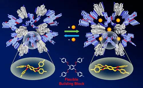 三維共價有機框架(3D COFs)的構建是非常困難的,因為它們的合成驅動力主要來自共價鍵的形成。為了便于合成,剛性結構單元始終是設計3D COFs的首選。原則上,用柔性的單元構建3D COFs應該很有吸引力,但是此類系統的發展遇到了瓶頸,尤其是在設計合成和結構確定方面。這項成果報道了一種新型的高度結晶的3D COF (FCOF-5),在結構基元主鏈中具有柔性的C–O單鍵。有趣的是,FCOF-5是柔性的,在蒸汽吸附/解吸時發生可逆的膨脹/收縮,表明存在呼吸運動。進一步制備了一種具有FCOF-5結構的智能軟聚合物復合膜,該復合膜具有可逆的蒸汽觸發相變。因此,由柔性單元構建的3D COFs可以表現出有趣的呼吸行為,這種柔性多孔晶體將具有多種有趣特性。