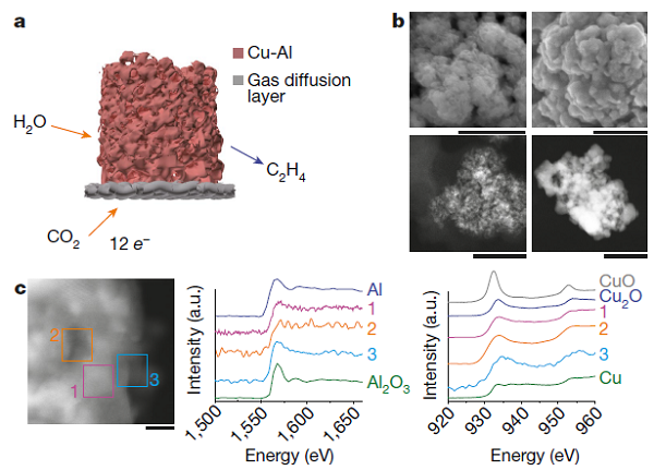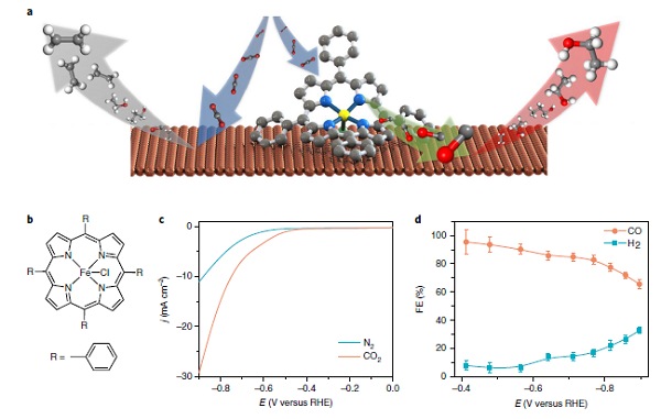 多倫多大學的Edward H. Sargent(通訊作者)課題組[3]提出了一種分子-金屬催化劑表面的協同催化劑設計。這一設計旨在建立富含反應中間體的局部環境,從而提高從二氧化碳和水電合成乙醇的能力。研究人員首先利用一系列能夠催化二氧化碳形成一氧化碳的卟啉基金屬復合物對銅表面進行功能化,再利用DFT計算和拉曼、X射線等譜學表征,發現局部一氧化碳展現出高濃度特點,能夠有利于碳碳耦合、控制反應路徑以高效生產乙醇。驗證實驗的結果,二氧化碳-乙醇轉變的局部電流密度也達到了(124?mA?cm?2)(?0.82 V vs RHE),但由于抑制氫氣生成的問題沒有解決,其法拉第效率略有下降(41%)。這一催化劑后又被集成到薄膜電極組裝系統,也實現了13%左右的全局能量效率。