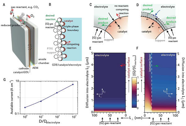 二氧化碳電化學還原產生C2化學品的另外一個挑戰是生成的氣體都是疏水的,而產物反應又需要水分子的參與。氣體往往需要擴散穿過液態電解質與催化劑表面接觸,這也限制了C2生產能力的進步。為了克服這一問題,多倫多大學的Edward H. Sargent和David Sinton(共同通訊作者)合作[4]將離子聚合物(ionomer)組裝體和銅電催化劑結合形成新型3D催化劑。這一復合催化劑具有離子聚合物體相異質結(CIBH)結構,能夠分離氣體、離子和電子輸運。這一結構包含金屬層和超精細離子聚合物層,其中離子聚合物層進行了疏水和親水功能化,能夠組裝形成結構差異化的形貌,并有利于氣體和離子在金屬表面的輸運:氣體傳輸可通過疏水區域的側鏈進行提升,使氣體擴散得以擴展;同時,水的吸收和離子出現在親水區域。由此帶來的結果是,活性位點附近的氣體反應物、離子和電子大幅增加,反應界面由亞微米尺度提升到了幾個毫米水平。以此為策略設計的催化劑在7M磷酸鹽電解質中實現了高效的二氧化碳電還原反應,乙烯的局部電流密度可以到達1.3 A cm?2(陰極能量效率為45%)。這一電流密度是迄今為止在二氧化碳生產C2化學品過程中觀測到的最高值,已經可以完全滿足工業規模相關的應用需求。