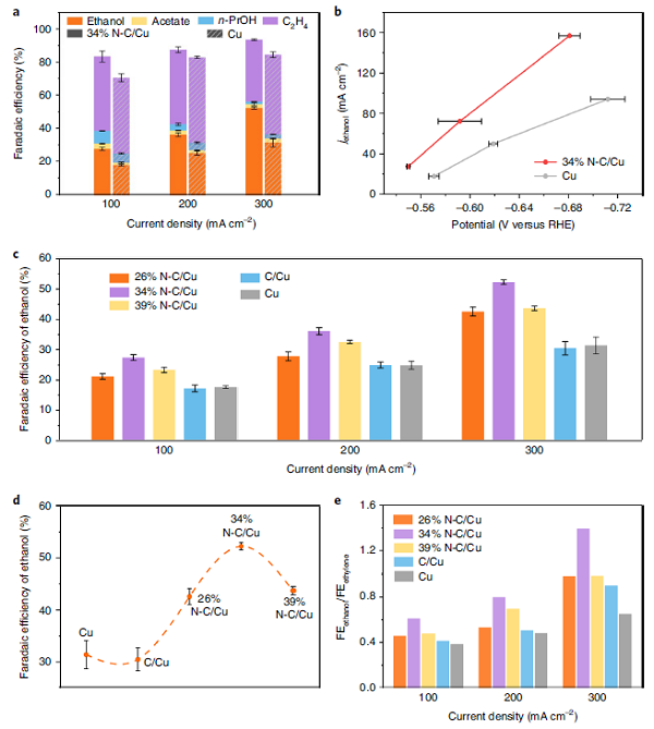 而在二氧化碳電還原反應中,乙醇和乙烯是兩種主要的C2競爭產物。一般認為,這兩種產物衍生自共同的關鍵中間體(HOCCH*),HOCCH*中碳氧鍵斷裂產生了乙烯。對二氧化碳電還原反應進行技術經濟分析發現,只有當局部電流密度超過100 mA cm?2時,C2產物才會開始產生經濟效益。這意味著即使二氧化碳電還原反應的全局電流密度超過10 mA cm?2,乙醇產物的法拉第效率需要進一步提高才能推進商業化。Edward H. Sargent(通訊作者)的團隊[5]報道了一類可實現52%左右乙醇法拉第效率和31%乙醇陰極能量效率的催化劑。研究發現,在銅表面涂覆氮摻雜碳層,賦予了催化劑強大的供電子能力,可以在HOCCH*中提高碳碳鍵的耦合、抑制碳氧鍵的斷裂,從而增強二氧化碳電還原過程中的乙醇產物選擇性。根據該研究的數據,利用氮摻雜碳層改性后銅催化劑在電流密度超過100 mA cm?2時的總法拉第效率高達83%,乙醇的法拉第效率也大幅提高,超過了已有報道的最佳數值(41%)。