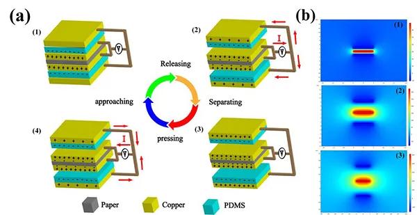 (b)使用COMSOL對MT-TENG的電極電位分布進行了數值計算。
