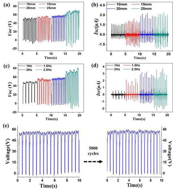 (a,b)MT-TENG的開路電壓和短路電流隨位移幅值的變化而變化;(c,d)MT-TENG的開路電壓和短路電流隨頻率的變化而變化;(e)通過5000個連續工作周期,研究了MT-TENG的穩定性;