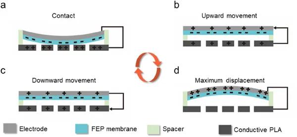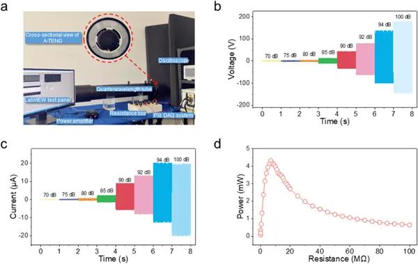 低頻聲能在學(xué)術(shù)領(lǐng)域和工業(yè)界都受到了極大的關(guān)注。在我們的生活環(huán)境中,低頻聲波波長較長,不易被吸收或隔離。但是,這種機(jī)械能如果采用適當(dāng)?shù)钠骷O(shè)計和能量轉(zhuǎn)換方法,如壓電法和電磁法,可以將其采集并轉(zhuǎn)化為電能,有望實現(xiàn)對電子器件的供電。對于壓電器件,通常采用高壓電系數(shù)的陶瓷材料,但其與空氣的阻抗不匹配極大影響了聲電轉(zhuǎn)換效能的提升。對于電磁方式,通常需要線圈、磁鐵等笨重的部件,不利于微弱環(huán)境聲能量采集系統(tǒng)的實現(xiàn)。近年來,王中林院士提出的新型摩擦納米發(fā)電機(jī)(TENG)在聲能采集領(lǐng)域顯示出廣闊的前景。與壓電聲學(xué)器件相比,TENG器件常具有軟、柔性的特點,可以顯著降低能量采集器與入射聲波之間的聲阻抗失配,以提高聲能量收集裝置的輸出功率。此外,摩擦電器件具有廣泛的材料選擇性,給器件的制作及實現(xiàn)帶來了極大便利。到目前為止,已經(jīng)有幾項研究顯示了TENG在聲波能量收集和自供電傳感方面的潛力。上述器件主要采用實現(xiàn)聲壓增強(qiáng)的亥姆霍茲聲諧振器。然而,當(dāng)亥姆霍茲諧振腔底部采用柔性膜時,往往會出現(xiàn)聲壓放大效果的降低。此外,基于亥姆霍茲諧振器的聲能采集器對柔性部件的變化非常敏感,這表明要實現(xiàn)最優(yōu)性能,需要復(fù)雜的調(diào)試工程。實際上,四分之一波長諧振器是另一種重要的聲學(xué)諧振器,與亥姆霍茲諧振器相比,它具有設(shè)計簡單、制作方便等獨特的優(yōu)點。但這種結(jié)構(gòu)在聲學(xué)TENG領(lǐng)域還沒有得到足夠的重視。此外,對于聲摩擦納米發(fā)電器件,其關(guān)鍵部件之一是用于聲波傳播的穿孔板。在以往的研究中,這一層通常由多孔材料組成,如微穿孔鋁、導(dǎo)電織物、泡沫銅等。然而,這些材料的孔徑很難調(diào)控,粘滯損失對聲衰減的影響也沒有進(jìn)行探討,對孔的加工工序也較復(fù)雜。針對上述問題,近日,在南京郵電大學(xué)謝燕楠教授和袁明副教授研究團(tuán)隊,提出了一種3D打印的聲學(xué)摩擦納米發(fā)電機(jī)(A-TENG),具有結(jié)構(gòu)可控、一次性成型、制作簡單、成本低等特點。通過四分之一波長管優(yōu)異的放大性能及器件參數(shù)的合理設(shè)計,該系統(tǒng)在100 dB聲壓級激勵下能夠產(chǎn)生4.33 mW的峰值功率輸出,實現(xiàn)對72個LED的驅(qū)動。當(dāng)聲壓級為90分貝時,即可驅(qū)動一個商用計算器連續(xù)工作,表明其作為低功耗電子設(shè)備電源的應(yīng)用前景。此外,團(tuán)隊還開發(fā)了由A-TENG、AI語音識別芯片和控制電路組成的智能邊緣系統(tǒng)。語音信號首先可以通過A-TENG轉(zhuǎn)化為電信號,然后由內(nèi)置預(yù)訓(xùn)練的AI芯片進(jìn)行邊緣識別和處理,產(chǎn)生相應(yīng)的指令動作來控制后續(xù)電路。該智能邊緣系統(tǒng)無需云計算即可實現(xiàn)實時語音識別,展示了聲學(xué)TENG在低功耗、高性價比的物聯(lián)網(wǎng)領(lǐng)域的巨大潛力。該成果以題為“A 3D-printed acoustic triboelectric nanogenerator for quarter-wavelength acoustic energy harvesting and self-powered edge sensing”發(fā)表在Nano Energy上(IF 16.602)。圖1 四分之一波長聲能采集系統(tǒng)的示意圖