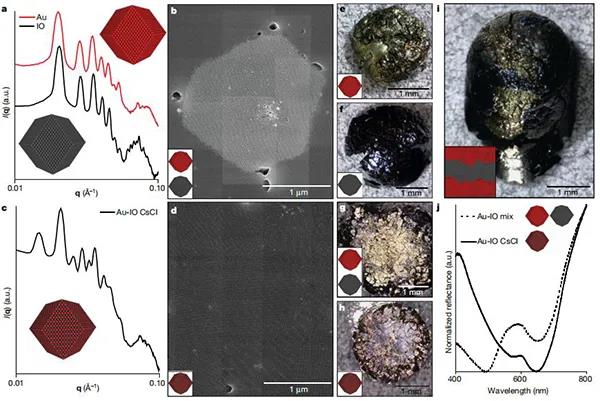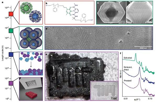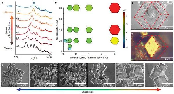 納米顆粒組裝已經被提出作為一種理想的方法來構建材料的層次組織,通過選擇納米尺度的組件來自下而上構建整個材料。多尺度結構控制是非常可取的,這是源于化學組成、納米尺度順序、微觀結構和宏觀形式都影響物理性質。然而,通常決定納米顆粒有序的化學相互作用,并不能提供任何在更大長度尺度上操縱結構的手段。微觀結構和宏觀形態仍然是未充分探索的設計參數,開發能夠將單個自組裝結構結合成宏觀的加工技術,將是開發在所有尺寸狀態下具有完全結構控制的納米顆粒的重要步驟。因此,基于納米顆粒的材料開發需要在不犧牲其自組裝納米級排列的情況下,定制微觀和宏觀結構的加工策略。其中,納米復合技術(NCT)非常適合生產此類分層材料,源于其固有的可伸縮成分組成,并使用動態結合相互作用來決定納米顆粒如何排列成有序陣列。每個NCT均由覆蓋有聚合物的無機納米顆粒組成,其中每個聚合物鏈均終止于超分子結合基團。將溶劑分散的NCT與互補結合基團混合后,超分子相互作用將顆粒組裝成更大的結構。由于將NCT連接在一起的超分子相互作用是動態的,因此通過其解離溫度冷卻一系列NCT,可使它們組織成有序的超晶格。然而,由于聚合物鏈在干燥過程中迅速收縮,之前試圖從組裝溶劑中去除晶格的嘗試導致了晶格的混亂。因此,從這些NCTs中形成獨立的宏觀固體,首先需要一些方法來穩定它們,以防止在溶劑去除過程中的順序損失。今日,美國麻省理工學院 Robert J. Macfarlane教授課題組(通訊作者)提出通過逐漸引入與聚合物發生不利相互作用的非溶劑來穩定晶格,以防止聚合物塌陷,與該非溶劑的相互作用將導致鏈采用較致密的構型并使晶格收縮。從而演示了快速組裝以克為單位的多面納米顆粒超晶格微晶的方法,利用此方法這些晶體可以類似于塊狀固體的燒結,進一步形成宏觀物體。該方法的關鍵是:控制納米顆粒組裝的化學相互作用在后續處理步驟中保持活性,這使得在形成宏觀材料時,可以保留顆粒的局部納米級有序性。可以根據超晶格微晶的尺寸,化學組成和晶體對稱性來調整固體的納米結構和微觀結構,微觀結構和宏觀結構可以通過后續的加工步驟進行控制。因此,這項工作提供了一種通用的方法,可以同時控制分子到宏觀長度尺度上的結構組織。相關研究成果以“Macroscopic materials assembled from nanoparticle superlattices”為題發表在Nature上。