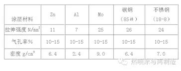 (1)涂層結構和特性。線材火焰噴涂的涂層結構為明顯的層狀結構,涂層中有較多的孔隙和氧化物夾渣。涂層性能依據噴涂工藝和噴涂材料的不同而各異,一般數據下表。