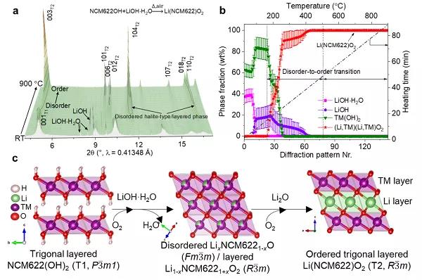 圖1 a氫氧化物前驅(qū)體Ni0.6Co0.2Mn0.2(OH)2和一水合氫氧化鋰的變溫同步輻射衍射圖;b 物相組成隨溫度變化圖;c 高溫固相反應(yīng)所對(duì)應(yīng)的結(jié)構(gòu)衍變機(jī)理圖。