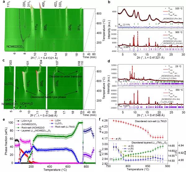 圖2 a 碳酸鹽前驅(qū)體Ni0.6Co0.2Mn0.2CO3的變溫同步輻射衍射圖及b 加熱至320 °C和900 °C時(shí)的Rietveld精修圖;c Ni0.6Co0.2Mn0.2CO3和LiOH·H2O的變溫同步輻射衍射圖及d 在室溫25 °C和加熱至550 °C時(shí)的Rietveld精修圖;e 混合物加熱過程中物相組成變化圖;f 無序巖鹽結(jié)構(gòu)(Fmm)和有序?qū)訝罱Y(jié)構(gòu)(Rm)加熱過程中的晶胞參數(shù)變化曲線。