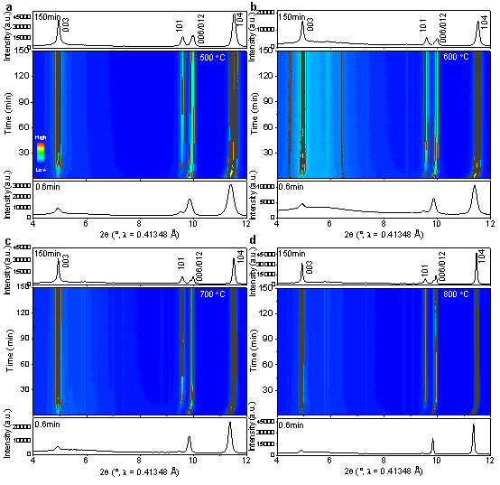 圖3 Ni0.6Co0.2Mn0.2(OH)2和LiOH·H2O在不同溫度下的同步輻射衍射隨反應(yīng)時(shí)間變化圖:a 500 °C,b 600 °C,c 700 °C,d 800 °C。
