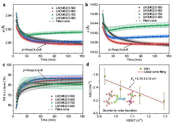 圖4 高溫鋰化反應(yīng)動(dòng)力學(xué)研究:無序?qū)訝頛i1-x(Ni0.6Co0.2Mn0.2)1+xO2結(jié)構(gòu)中a 晶胞參數(shù)a,b 晶胞參數(shù)c,c Li/TM混排在不同溫度下隨時(shí)間的變化;d Li/TM離子由無序到有序轉(zhuǎn)化活化能計(jì)算圖。