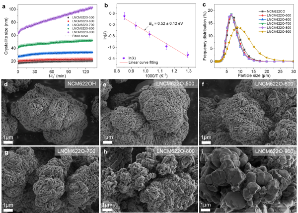 圖5高溫晶體生長動(dòng)力學(xué)研究:a 晶粒尺寸在不同溫度下隨燒結(jié)時(shí)間的變化;b 晶粒生長動(dòng)力學(xué)活化能計(jì)算圖;前驅(qū)體及不同溫度煅燒下c 粒徑分布圖和d-i 掃描電子顯微鏡圖。
