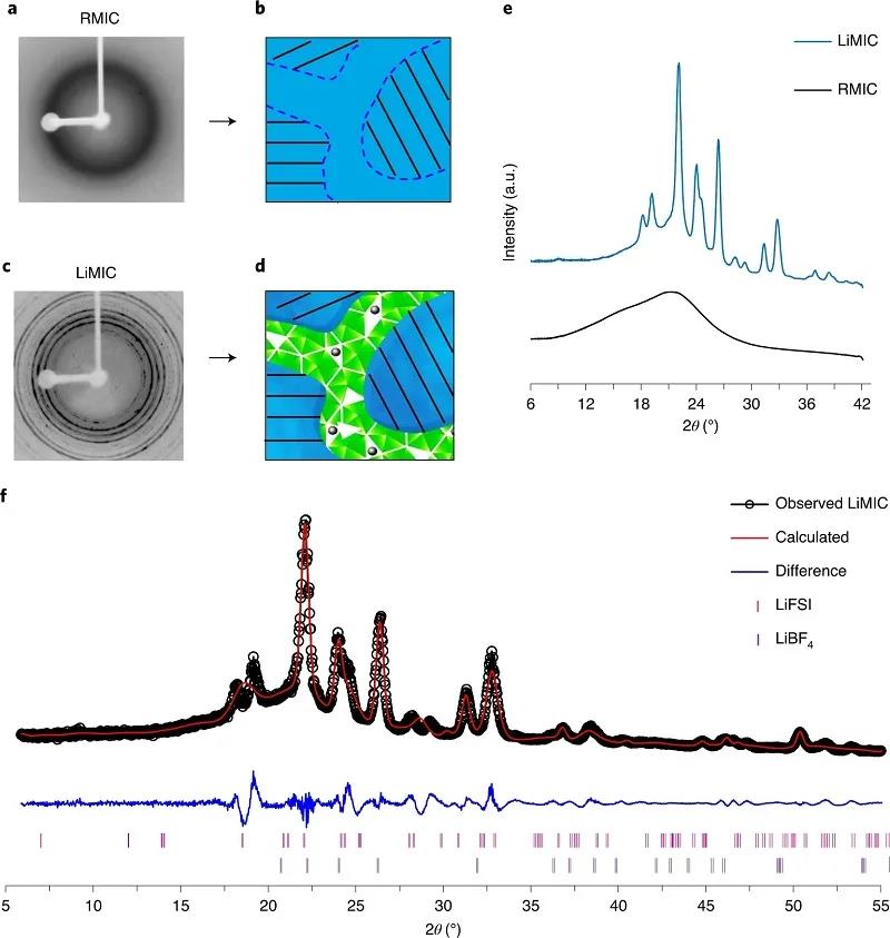 近日,美國弗吉尼亞理工學(xué)院與州立大學(xué)Louis A. Madsen(通訊作者)等人報道了一種固態(tài)MIC電解質(zhì),其不含揮發(fā)性溶劑,且顯示出高離子導(dǎo)電性、有利電極-電解質(zhì)接觸和高熱穩(wěn)定性,同時具有足夠的模量作為Li金屬電池的隔膜。在電解質(zhì)中加入Li鹽可以增加Li離子的導(dǎo)電性,并且為電極上的反應(yīng)提供Li離子。通過實驗表明,在包含N-丙基-N-甲基吡咯烷雙(氟磺酰基)酰亞胺(C3mpyrFSI)與LiFSI(3.2 mol kg-1)的離子液體電解質(zhì)(ILEs)中,Li金屬的循環(huán)速率很高。基于與離子液體和濃鋰鹽結(jié)合的取向液晶聚合物的分子離子復(fù)合電解質(zhì),不僅實現(xiàn)高Li密度、高強度(200 MPa)和不可燃性,而且具有出色的Li+電導(dǎo)率(在25 °C時為1 mS cm-1)和電化學(xué)穩(wěn)定性(對比Li|Li+為5.6 V),同時抑制了枝晶的生長且表現(xiàn)出較低的界面電阻(32 Ω cm2),以及在Li對稱電池循環(huán)過程中顯示出過電位(在1 mA cm-2時≤120 mV)。異質(zhì)鹽摻雜工藝會修改局部有序的聚合物離子組裝,以結(jié)合填充有缺陷的LiFSI和LiBF4納米晶體的晶間網(wǎng)絡(luò),從而極大增強Li+傳輸。總之,這種模塊化材料制造平臺將陶瓷類導(dǎo)體的快速傳輸與聚合物電解質(zhì)的優(yōu)異柔性結(jié)合起來,為安全、高能量密度的能量存儲和轉(zhuǎn)換應(yīng)用提供了前景。研究成果以題為“Solid-state rigid-rod polymer composite electrolytes with nanocrystalline lithium ion pathways”發(fā)布在國際著名期刊Nature Materials上。