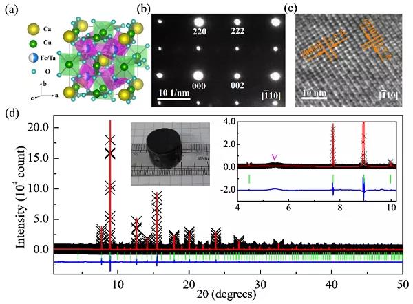 圖1 (a) CaCu3Fe2Ta2O12的晶體結(jié)構(gòu)圖,(b) 選區(qū)電子衍射圖,(c) 高分辨透射電子顯微鏡圖,(d) 同步輻射X射線衍射圖。