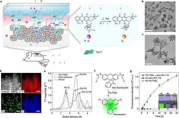 過渡金屬介導的生物正交催化激發了人工化學的一個新分支,與酶促反應互補,使生物分子的選擇性標記或通過非自然過程原位合成生物活性劑成為可能。然而,由于金屬毒性的安全問題和催化劑的應用過程復雜等原因,生物正交催化在體內的有效應用仍然具有挑戰性。基于此,浙江大學顧臻教授(通訊作者)等人報道了一種具有生物正交催化活性的微針陣列貼片裝置。作者以聚乙烯醇(PVA)為基體,沉積有鈀納米粒子(Pd NPs)的TiO2納米片(Pd-TNSs)為納米填料,制備了該微針陣列貼片裝置。其中,摻入Pd-TNSs可以增強微針在干玻璃狀態下的力學性能,賦予它們足夠的強度,以微創的方式穿透皮膚。當置于水環境中時,微針就會變成膨脹的水凝膠狀態,形成多孔結構。因此,三個層次的結構層次,即三維(3D)針陣列、每個針基質中的微孔和網絡中高度暴露的Pd-TNSs表面,促進了籠狀分子的擴散以與Pd納米粒子接觸,從而促進了它們的活化。需注意,通過使用小鼠黑色素瘤模型,證明了系統給藥的前藥N-烯丙基氧羰基籠狀阿霉素(alloc-DOX)的局部腫瘤內活化,不僅能夠增加劑量,而且限制了對健康器官和組織的副作用。此外,Pd-TNSs與PVA之間的界面相互作用以及PVA鏈形成的氫鍵使得微針針尖在水合物狀態下具有足夠的力學韌性,從而易于去除整個貼片,而不會留下有害的過渡金屬(TMs)或引起炎癥。
