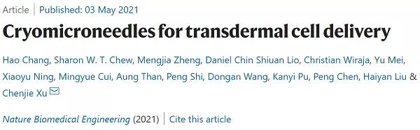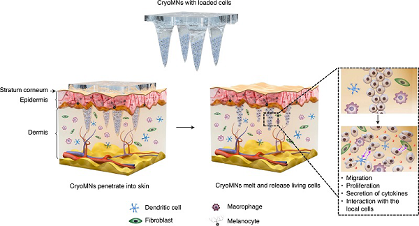 研究發現,簡單、安全和有效的治療細胞的透皮遞送技術有助于治療皮膚疾病的細胞療法。通過皮下注射針頭的常規細胞遞送與患者依從性差有關,存在需要經過培訓的人員、產生廢物且具有不可忽視的傷害和感染風險的問題。基于此,香港城市大學Chenjie Xu(通訊作者)等人報道了一種冷凍微針貼片的設計和概念應用,并且該冷凍微針貼片可用于活細胞的透皮傳遞。這種微針是用預先懸浮的細胞在低溫培養基中進行分步低溫微模塑法制備而成,在細胞復蘇后可以很容易插入豬皮中溶解。在小鼠體內,冷凍微針遞送的細胞保留了它們的生存能力和增殖能力。在患有皮下黑色素瘤的小鼠中,通過冷凍微針遞送的卵清蛋白脈沖的樹突狀細胞引起了更高的抗原特異性免疫反應,并且導致腫瘤生長比靜脈和皮下注射的細胞更慢。具有生物相容性的冷凍微針可促進微創細胞遞送,用于一系列的細胞治療。