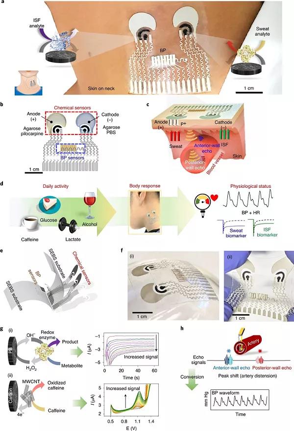 為了監測日常活動對人體生理反應的影響,需要一種能夠同時跟蹤代謝和血流動力學參數的可穿戴器件。基于此,美國加州大學圣地亞哥分校Joseph Wang和Sheng Xu(共同通訊作者)等人報道了一種非侵入性皮膚穿戴器件,通過超聲波傳感器同時監測血壓和心率,并通過電化學傳感器同時監測多種生物標志物。作者優化了集成器件,使其在符合彎曲皮膚表面的同時提供力學彈性和靈活性,并且確保可靠地感知組織間液中的葡萄糖和汗液中的乳酸、咖啡因和酒精,而各個傳感器之間沒有串擾。在人類志愿者身上,該器件捕捉到了食物攝入和運動的生理效應,特別是在食物消化后葡萄糖的產生,通過糖酵解消耗葡萄糖,以及血壓和心率的增加,以補償氧氣的消耗和乳酸的產生。通過集成的可穿戴器件進行連續、同步的聲學和電化學傳感,可以豐富對人體日常活動響應的理解,并且有助于對異常生理變化的早期預測。