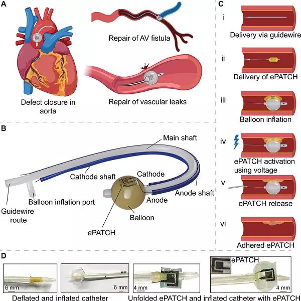 腔內缺損的外科手術修復與圍手術期發病率和死亡率有關。利用組織粘合劑進行血管內修復可以減少宿主組織損傷,但是目前的生物粘合劑設計不支持微創部署。其中,電壓激活的組織粘合劑為腔內修復提供了一種新的策略。為了促進電壓激活粘合劑的臨床轉化,新加坡南洋理工大學Terry W. J. Steele和麻省理工學院Ellen T. Roche(共同通訊作者)等人報道了將一種電壓激活貼片(ePATCH)與一種帶有可拉伸電極的微創導管(CATRE)配對,以對抗體內和體外管腔缺陷的修復。ePATCH/CATRE平臺展示了在濕組織基底上密封直徑高達2 mm的管腔缺損。防水密封件具有柔韌性和回彈力,可承受20000多次生理相關的應力/應變循環。當心臟跳動時,ePATCH被電激活,沒有觀察到電信號中斷。ePATCH/CATRE平臺具有廣泛的潛在應用,從假性動脈瘤/瘺的血管內治療到生物電極,再到電生理標測。