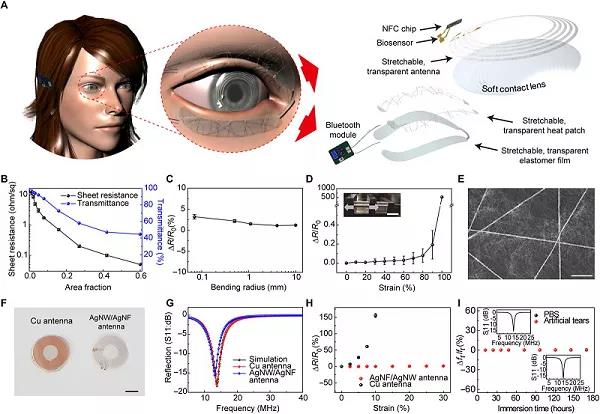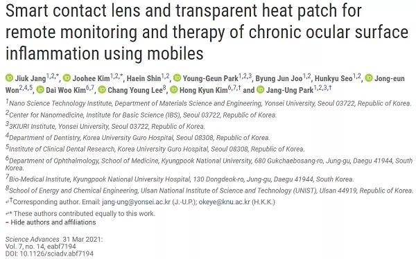可穿戴電子器件能夠監測人體的生理信號,提供生物醫學信息,已成為可持續的個人健康管理領域的熱點。基于此,韓國延世大學Jang-Ung Park和韓國慶北大學Hong Kyun Kim(共同通訊作者)等人報道了一種用于無線監測和治療慢性眼表炎癥(OSI)的柔性、智能隱形眼鏡和可連接皮膚的治療器件的人類先導性實驗。作為一種診斷器件,這種智能隱形眼鏡能夠使用石墨烯場效應晶體管實時測量淚液中基質金屬蛋白酶-9(OSI的生物標志物)的濃度。作為一種治療器件,作者還制備了一種可拉伸、透明的貼片,可以貼附在人眼瞼上。其中診斷和治療器件都可以使用智能手機進行無線通信,從而實現OSI的實時診斷和自動熱療。此外,作者利用活體動物和人體進行的體內實驗證實,作為一種無創、可移動的保健解決方案,它們具有良好的生物相容性和可靠性。