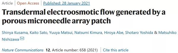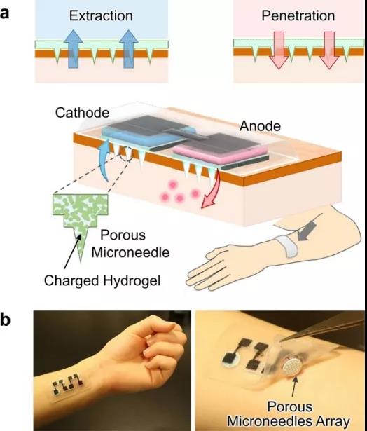 微針陣列是一種具有吸引力的選擇,通過微創手段來突破皮膚屏障進行有效的透皮給藥。基于此,日本東北大學Matsuhiko Nishizawa(通訊作者)等人報道了一種基于固體聚合物的離子導電多孔微針(PMN)貼片,其可應用于改善離子透入方面,是一種通過皮膚的直流電增強透皮分子傳輸的技術。利用帶電水凝膠修飾的PMN在離子電滲療法中有以下三個創新優勢:(1)通過低侵入性穿刺高阻力角質層來降低透皮阻力;(2)通過相互連接的微孔輸送大分子;(3)產生電滲流(EOF)。特別是,PMN產生的EOF極大地提高了透皮分子的滲透或提取,類似于由外部壓力引起的流動。作者利用豬皮樣品證明了EOF輔助遞送模型藥物(右旋糖酐)和葡萄糖提取的提高效率。此外,通過內置的酶生物電池(果糖/O2電池)為基于PMN的透皮EOF系統供電也被證明是一種可能的全有機離子導入貼片。