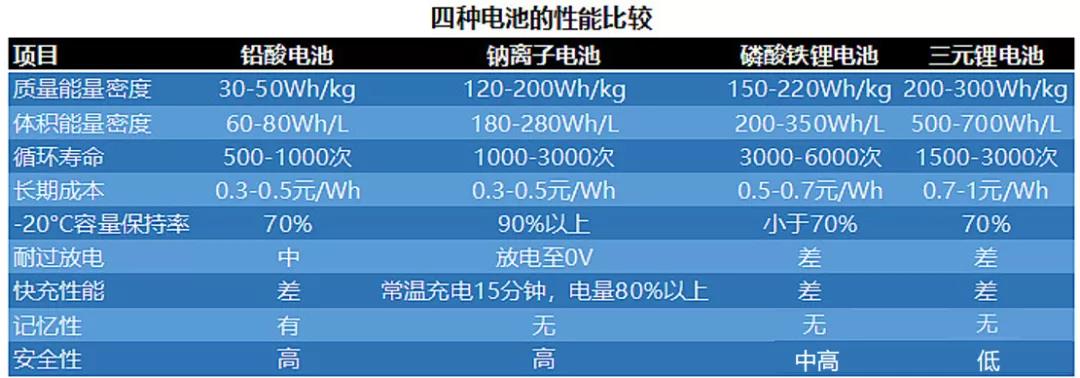 上面的表格,就是鈉離子電池與鉛酸電池、磷酸鐵鋰和三元鋰電池的性能比較。總結來說就是,鈉離子電池,既有磷酸鐵鋰的高能量密度,又有著鉛酸電池的低價格。所有磷酸鐵鋰和鉛酸電池的優點,他都有。