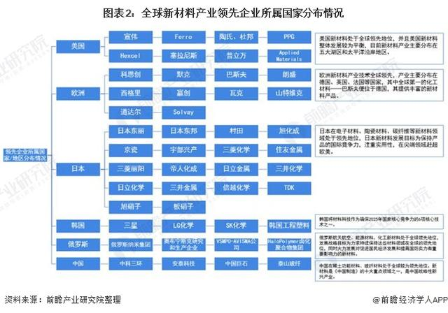 目前,美國、日本和歐洲等地區在經濟實力、核心技術、研發能力、市場占有率等方面占據絕對優勢,擁有成熟的新材料市場,多數產品占據全球市場的壟斷地位,是新材料產業主要的創新主體。陶氏、杜邦、康寧、3M、帝人、東麗、東洋紡、巴斯夫、贏創、索爾維、帝斯曼等跨國巨頭早已形成壟斷。這些大型跨國公司無論在經濟實力、核心技術還是在研發能力、市場占有率等多方面占據絕對優勢,并通過持續創新在高技術含量、高附加值的新材料市場中保持著主導地位。技術領域全面領跑的國家是美國,日本的優勢在化工新材料、電子信息材料、高分子材料等領域,歐洲則在結構材料、光學與光電材料、生態環境材料等方面。