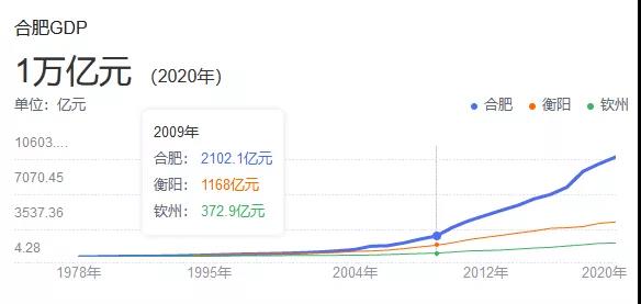 2009年之前,合肥連續幾年GDP增長都在300億元上下,而到了2010年,GDP增長直接達到了800億上下,比之前兩年的增長總量之和還多。