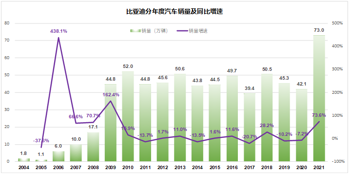 2010年之后,比亞迪就進入瓶頸期,號稱“比3萬”。每月3萬多,每年四五十萬的銷量,這種半死不活的狀態整整持續了10年,一直到2021年,比亞迪的年銷量才第一次超過2010年。
