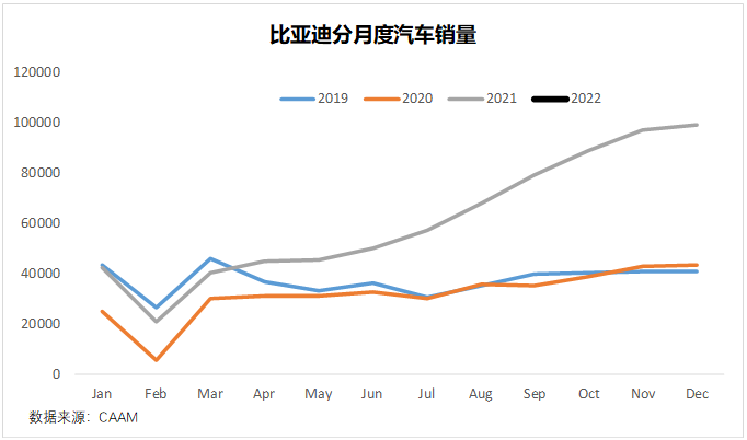 從月度銷量看,比亞迪最近3個月的月度銷量已經接近10萬輛,假如我們簡單的線性外推,比亞迪2022年的年度銷量應該在120萬輛左右。實際上,比亞迪公開給市場的業績指引是150萬輛,更激進當然是王傳福內部給的200萬輛的大躍進??紤]到過去10年,王傳福在汽車上放過的衛星不計其數,能兌現的場景確實不多,2022年120-150萬輛的銷量區間,其實還是比較合理的。