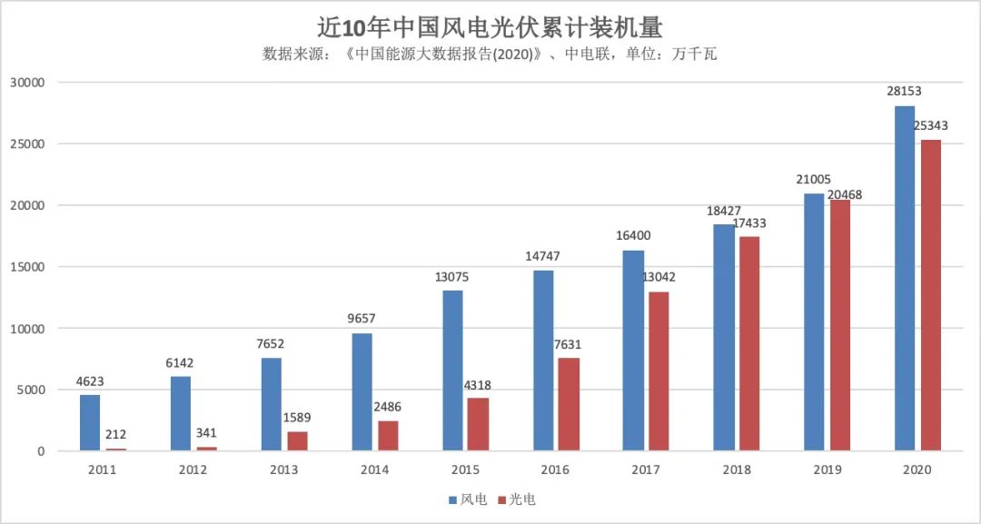 風電、光伏產業對未來十年年均新增裝機規模預測分別為5000萬-6000萬千瓦和7000萬-9000萬千瓦。這一預測下,屆時新能源裝機規模將大大超過12億千瓦的國家承諾下限,達到17億千瓦以上。增速也將顯著超過“十三五”時期。過去5年,風電年均新增約3000萬千瓦(其中2020年新增超過7000萬千瓦),光伏年均新增約5000萬千瓦。即便是第三方機構,給出的風光合計年均裝機預測也普遍達到1億千瓦以上。