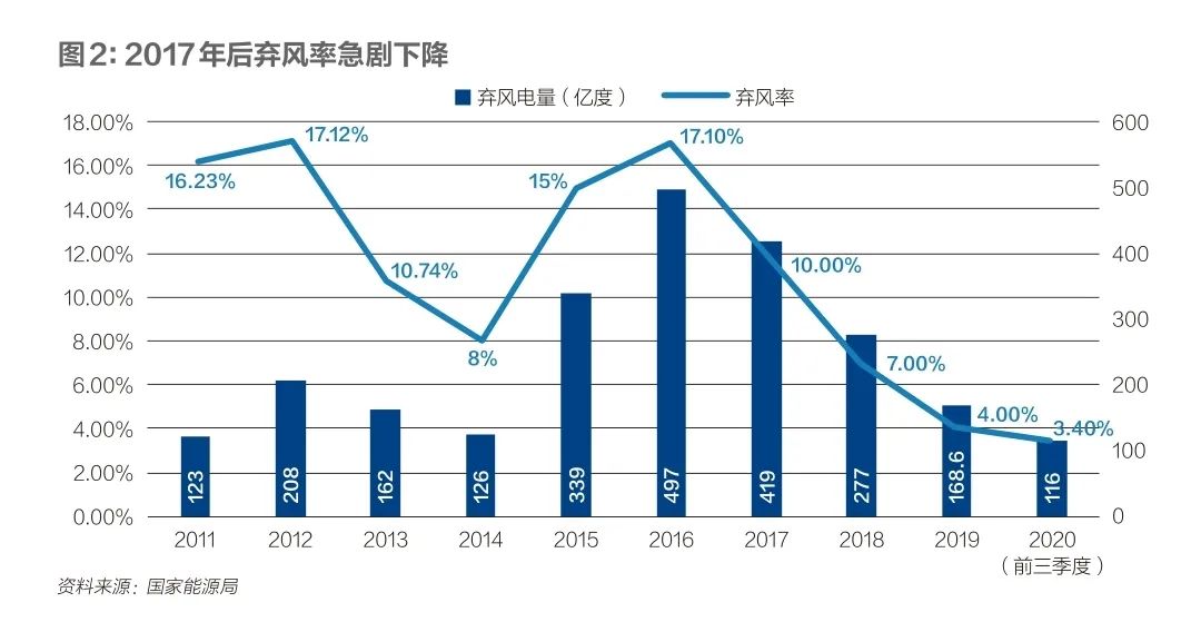 棄風棄光一度是困擾中國新能源發展的關鍵問題,2016年前后,部分省份棄風率一度超過30%,2017年之后雖然迅速緩解,但在未來更高比例的新能源裝機下,消納隱憂依然揮之不去。