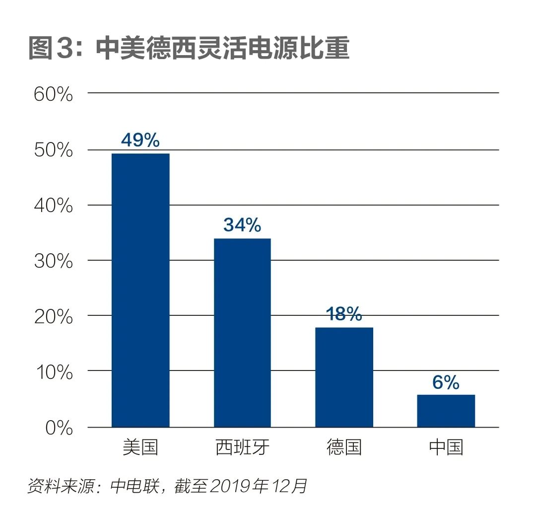 中電聯2019年12月發布的《煤電機組靈活性運行政策研究》顯示,歐美國家的靈活電源比重普遍較高,西班牙、德國、美國占比分別為34%、18%、49%,而中國占比不到6%。在中國新能源資源富集的三北地區,風電、太陽能發電裝機分別占全國的72%、61%,但靈活調節電源還不足3%。