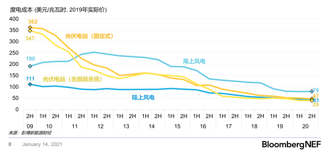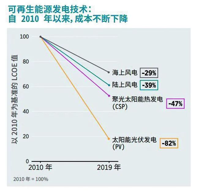 過去十年,光伏和風電的度電成本分別下降了約八成和四成,且仍有進一步下降空間。