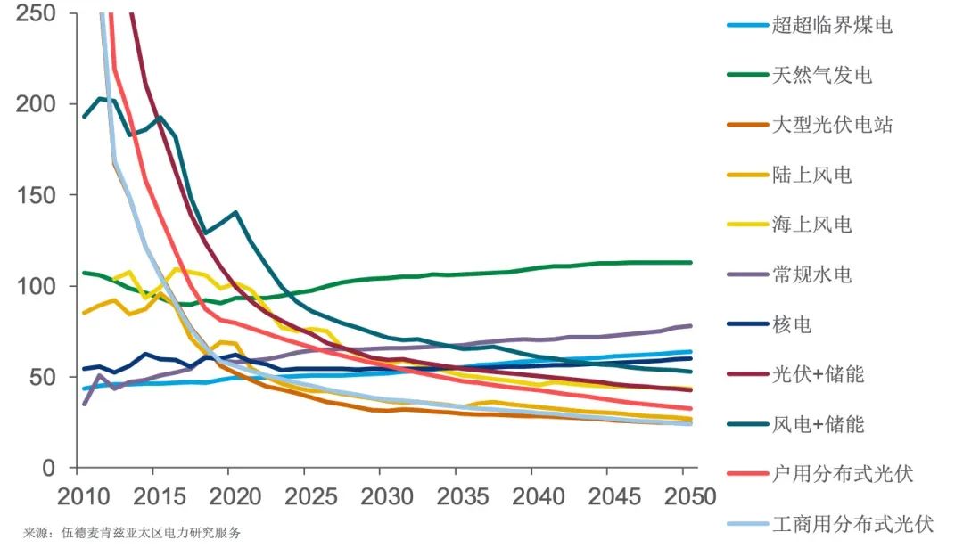 據國際能源咨詢公司伍德麥肯茲近期發布的報告,未來十年,火電的成本還將上升,光伏、風電則有40%—50%的成本下降空間。2035年是一個分水嶺,屆時中國所有可再生能源發電的成本都將比煤電低。如果再加上為碳排放支付的費用,煤電成本將高出10%—15%。