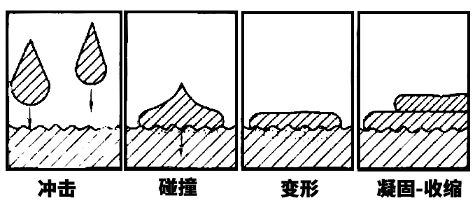 具有一定溫度和速度的噴涂粒子在接觸基體材料的瞬間,以一定的動能沖擊基體材料表面,產生強烈的碰撞。在碰撞基體材料的瞬間,噴涂粒子的動能轉化為熱能并傳遞給基體材料,在凹凸不平的基材表面上產生形變。由于熱傳遞的作用,變形粒子迅速冷凝并伴隨著體積收縮,其中大部分粒子呈扁平狀牢固地粘結在基體材料表面上,而另一小部分碰撞后經基體反彈而離開基體表面。隨著噴涂粒子束不斷地沖擊碰撞基體表面,碰撞一變形—冷凝收縮一填充連續進行。變形粒子在基體材料表面上,以顆粒與顆粒之間相互交錯疊加地粘結在一起,而最終沉積形成涂層。