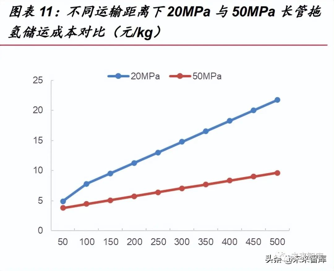 據中石油化工研究院數據,當運輸距離為 50km 時,氫氣的運輸成本為 4.9 元/kg; 隨著運輸距離的增加,長管拖車運輸成本逐漸上升,當距離 500km 時運輸成本近 22 元/kg,所以考慮到經濟性問題,長管拖車運氫一般適用于 200km 內的短距離和運量 較少的運輸場景。此外可以看出,隨著距離增加,20MPa 和 50MPa 運輸條件下的成 本逐漸分化,50MPa 下的成本優勢越來越明顯,當運輸距離為 200km 時,其成本差 距約 4 元/kg。實際上,超過 200km 的運輸距離將導致拖車及人員配置冗雜的問題。
