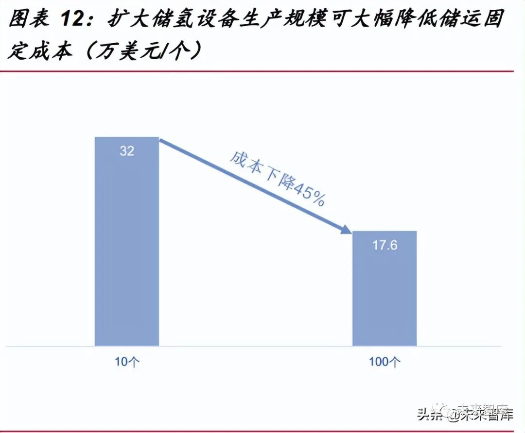未來長管拖氫儲運成本下降的有效路徑是:一方面可通過提高儲氫壓力,實現儲 氫密度和運輸效率都更高的氫氣儲運方式;另一方面,未來氫氣氣態儲運成本下降的 有效路徑是擴大相關設備生產量。單位成本將在規模效應下逐步下降。據 NREL (National Renewable Energy Laboratory)預測,當儲氫容器需求量從 10 增加到 100 個時,儲氫容器成本可下降約 45%。