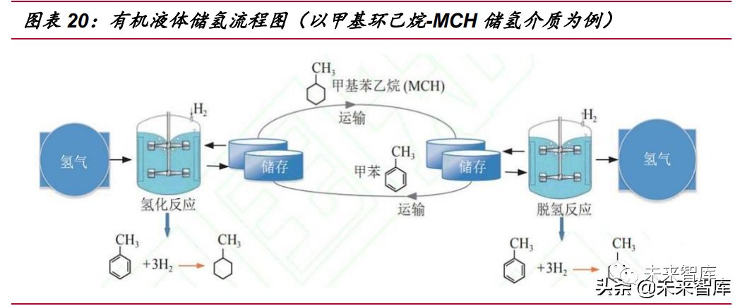 有機液體儲氫優勢在于:加氫后的有機氫化物性能穩定,安全性高,可常溫常壓 儲存,儲存方式與石油相似,質量儲氫密度高,可達 5.0-7.2%/wt。其劣勢在于:氫 氣純度不高,有幾率發生副反應,產生雜質氣體;反應溫度較高、脫氫效率較低、催 化 劑易被中間產物毒化;液氫儲存壓縮能耗過大,需配備相應的加氫、脫氫設備。 未來的技術突破方向是:提高低溫下有機液體儲氫介質的脫氫速率與效率、催化 劑 反應性能,改善反應條件、降低脫氫成本及操作難度。